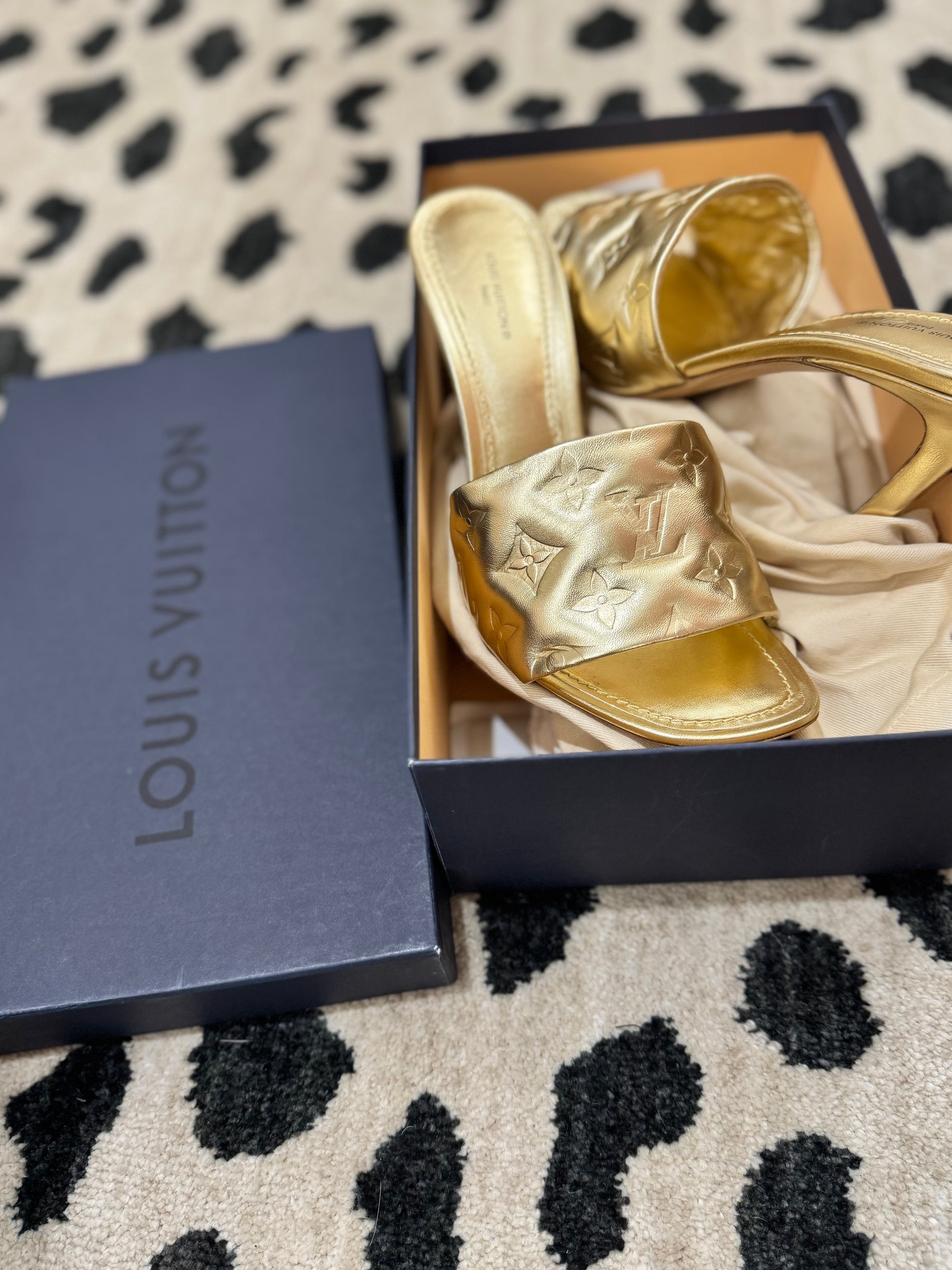 Louis Vuitton Gold Monogram Leather Mules – Luxury Block Heel Sandals